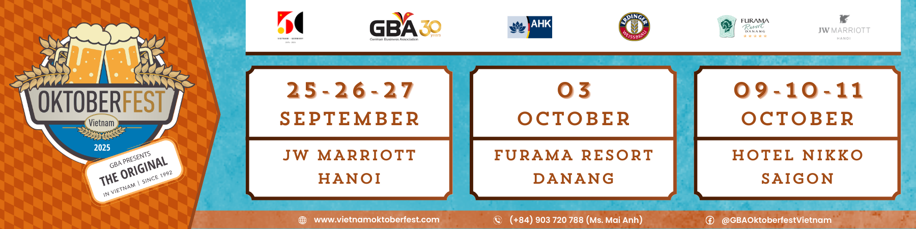 Hosted by the German Business Association (GBA) and AHK Vietnam, and held under the patronage of the Embassy and the Consulate General of the Federal Republic of Germany, this iconic cultural event returns with the valued partnership of ERDINGER, Furama Resort Danang, and JW Marriott Hotel Hanoi. We raise our glasses not only to tradition, but also to enduring friendships, with a subtle tribute to 30 years of GBA and 50 years of German–Vietnamese diplomatic relations.