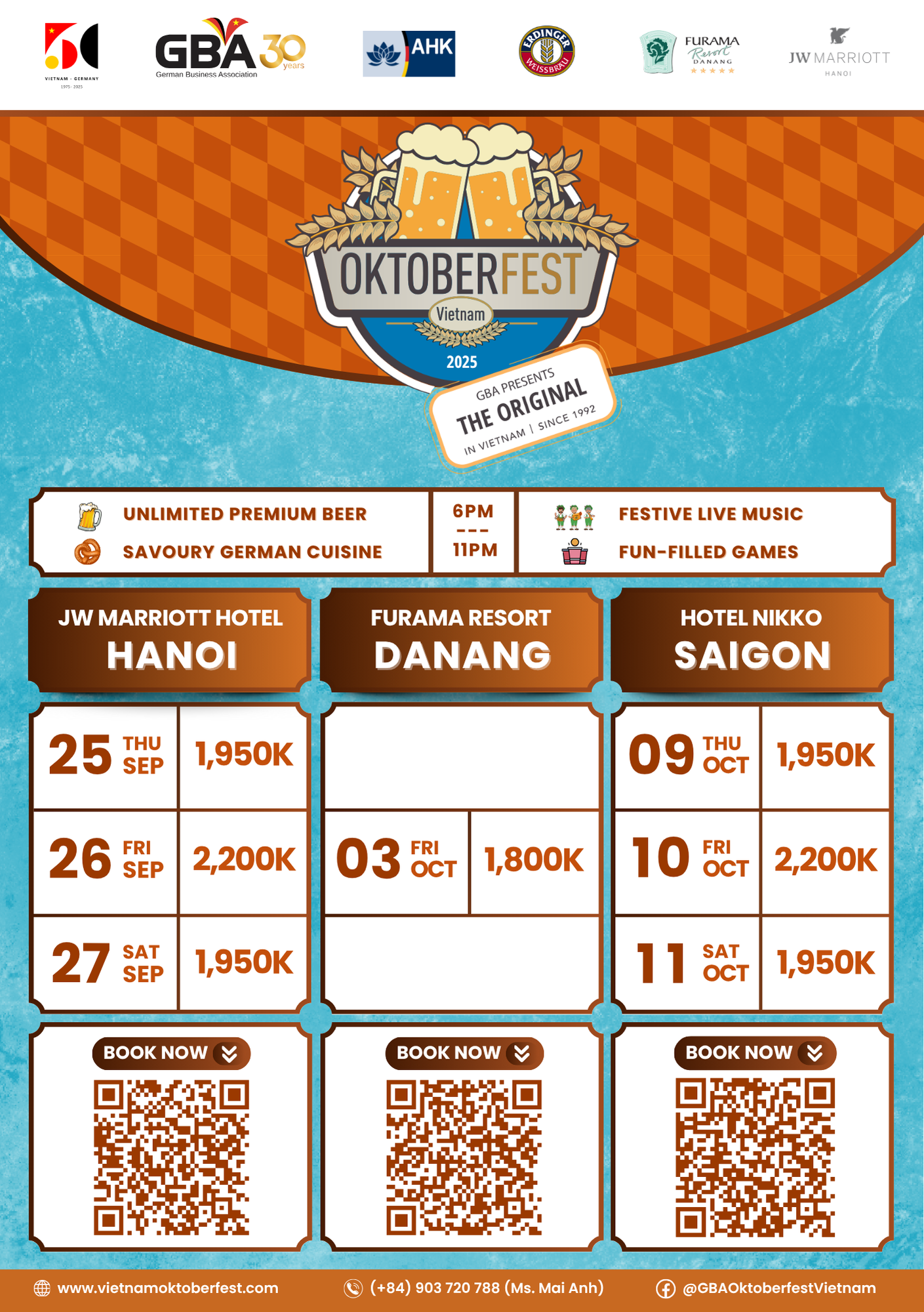 This is a unique opportunity to showcase your company to a broad audience while entertaining business partners, co-workers, and friends in a premium German festive setting. Put your brand at the heart of Vietnam’s most iconic German cultural event. Secure your package before 15 August 2025!