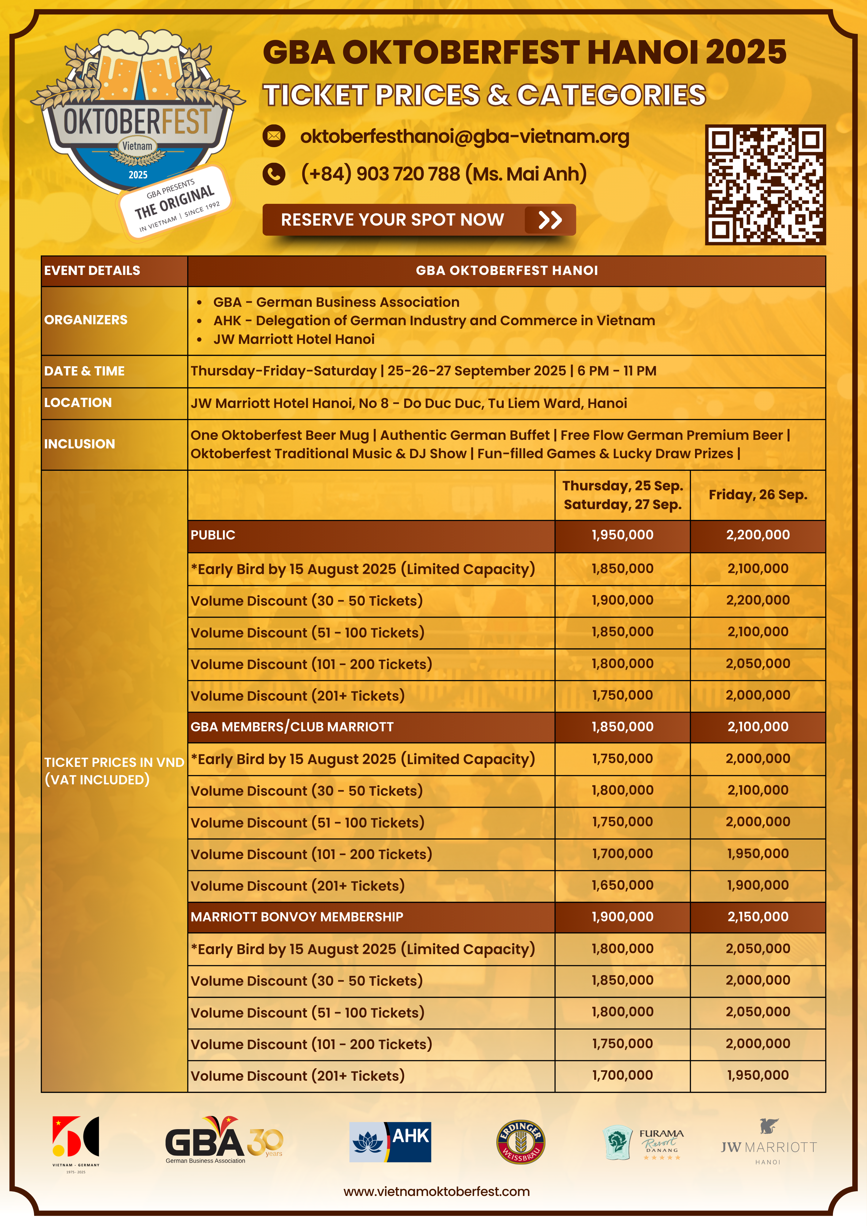 Contact our team in Hanoi at oktoberfesthanoi@gba-vietnam.org | Hotline: (+84) 903 720 788 (Ms. Mai Anh)
